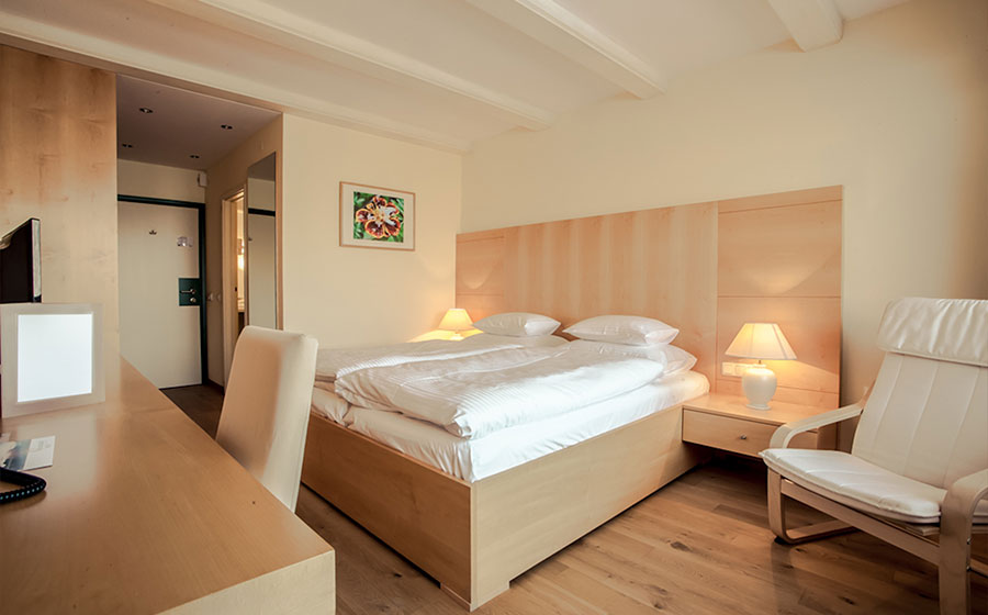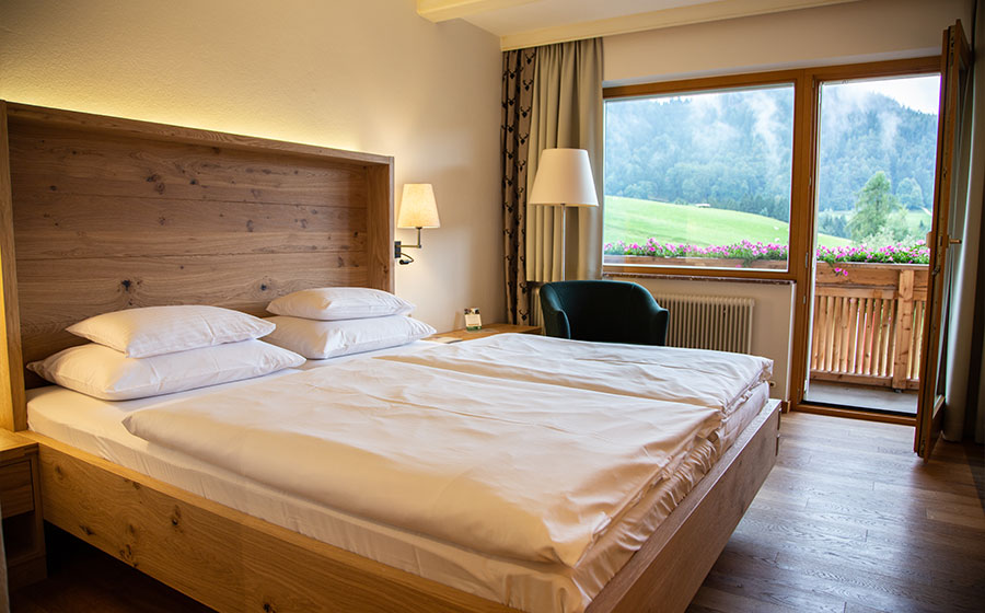Unsere freundlichen, hellen Zimmer sind mit Eichenholzböden und Möbel aus Eiche, Zirbe oder Ahorn ausgestattet.