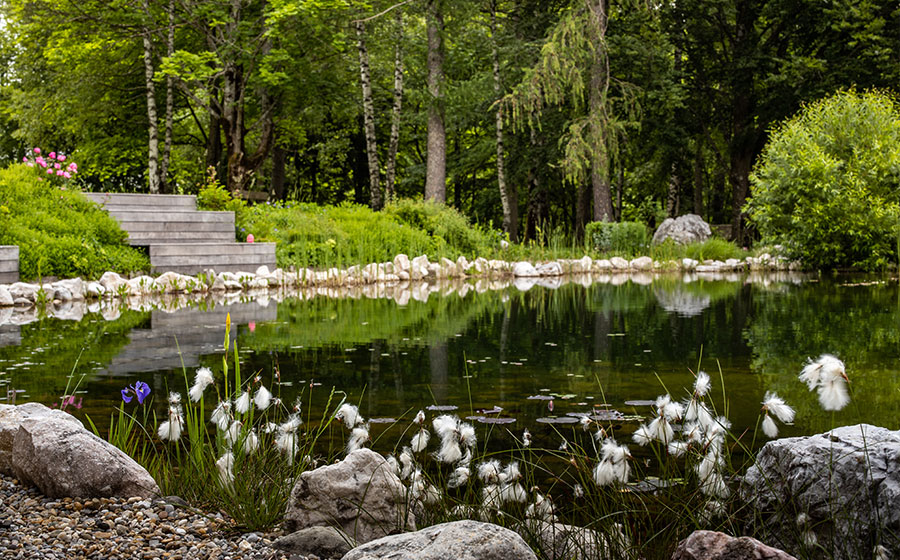 Ein Spaziergang im Gartenpark oder ein Sprung in unseren eingebetteten Naturbadeteich schafft Ruhe und Erholung im Grünen und sorgt für Entspannung für Körper und Geist.