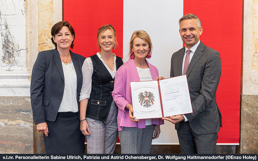Das Garten-Hotel Ochensberger wurde vom Bundesministerium für Arbeit und Wirtschaft in Wien als „Staatlich ausgezeichneter Ausbildungsbetrieb“ geehrt. Die feierliche Überreichung erfolgte durch den Wirtschaftsminister, Dr. Wolfgang Hattmannsdorfer im Rahmen einer offiziellen Zeremonie, bei der vorbildliche Ausbildungsbetriebe aus ganz Österreich vor den Vorhang geholt wurden. Mit der Verleihung dieser Auszeichnung würdigt die Republik Österreich jene Unternehmen, die sich in besonderer Weise für die qualitätsvolle Ausbildung junger Menschen engagieren. Mit aktuell 65 MitarbeiterInnen, davon 8 Lehrlingen gilt das Garten-Hotel Ochensberger seit über 57 Jahren als aktiver Lehrbetrieb in der Region und bietet Jugendlichen fundierte und zukunftsorientierte Karrierechancen im Tourismus.