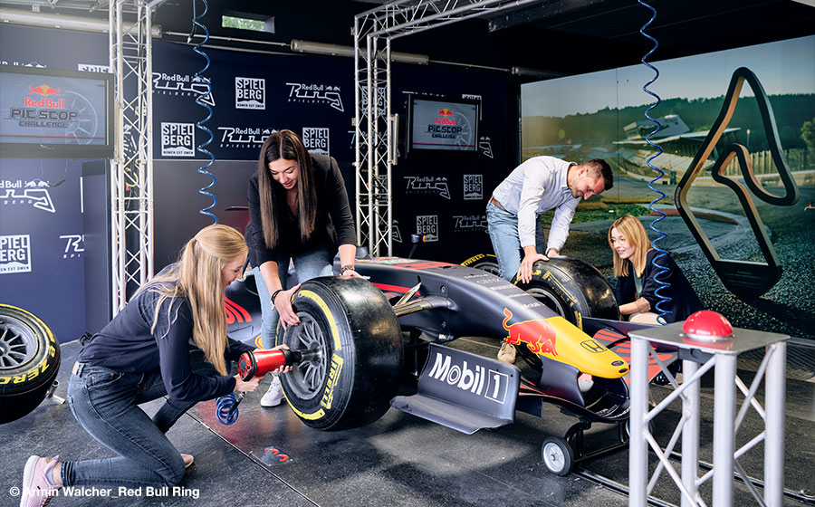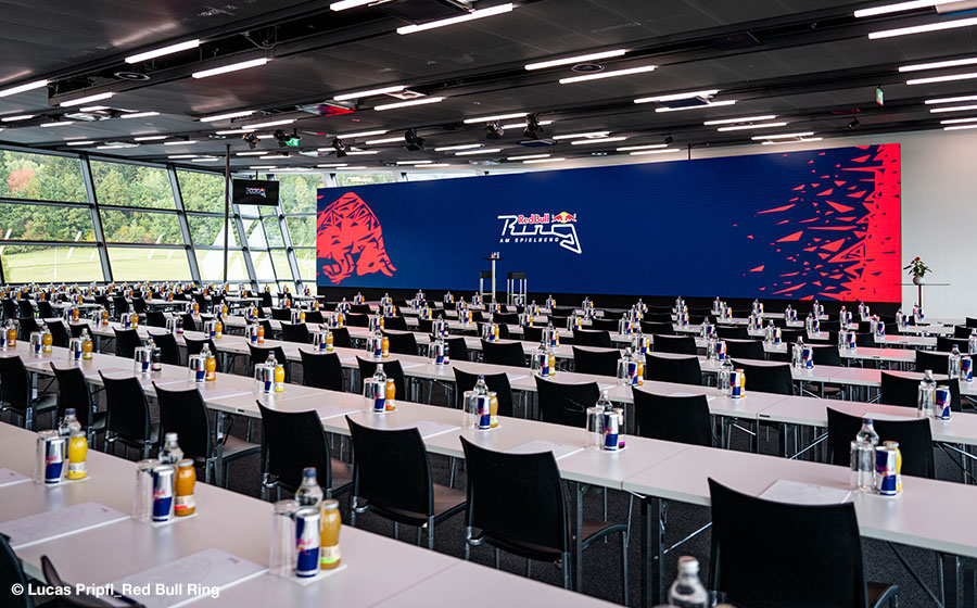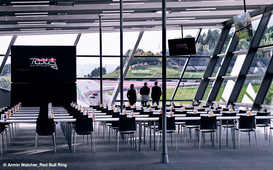 Hoch über dem Rennasphalt wartet am Red Bull Ring eine einmalige Kulisse: Das architektonische Highlight am Spielberg, der Red Bull Wing, der einem Heckflügel nachempfunden ist. Bei Konferenzen, Messen und Firmenfeiern aller Art sind der Kreativität auf 1.400 m2 keine Grenzen gesetzt. Mobile Trennwände splitten den Wing in drei Bereiche und ermöglichen flexible Raum- und Eventkonzepte. Der grandiose Ausblick über die GP-Strecke und die Murtaler Landschaft verleihen Veranstaltungen einmalige Strahlkraft. Den ultimativen Boost für jede Präsentation übernimmt eine 16 Meter breite LED-Wall.